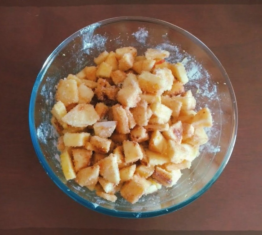 - Junta ás maçãs a canela, o açúcar, a farinha, a raspa e o sumo do limão.