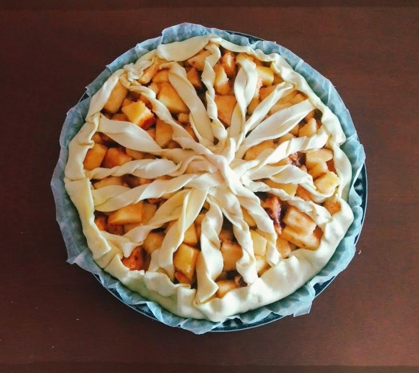 - Take a pie tin and cover it with baking paper and put a pastry puff sheet on it. Add the apple mix.
